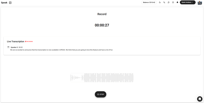 Want to transcribe audio in real time? Just open the Speak Web App, toggle live transcription on, and hit “Record.”