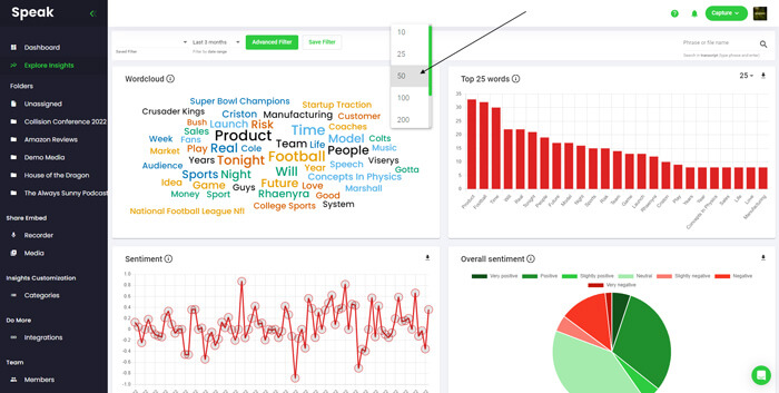 Want to specify the data in your word cloud even further? You can use the data filters on the top of the dashboard to display the word cloud based on folders, tags, insight categories, time and more!