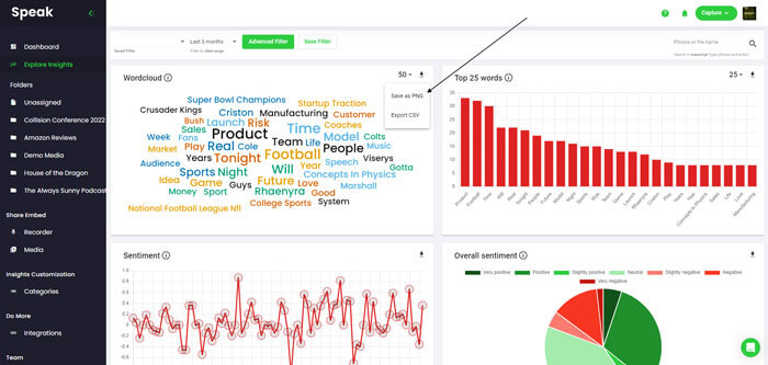 If you want to download the actual data, you can also export the word cloud as a CSV file! The CSV shows the words and how many times they were mentioned in your selected data.