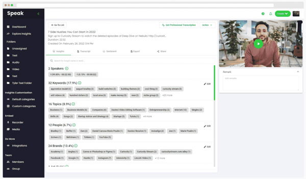 Speak’s speech recognition and natural language processing engine automatically transcribes and analyzes audio, video and text data to uncover important keywords, topics, key phrases, do sentiment analysis and more.