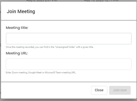 All you have to do is add your Meeting title and the meeting URL from either Google Meet, Zoom, Microsoft Teams, Webex or any other supported meeting platform.