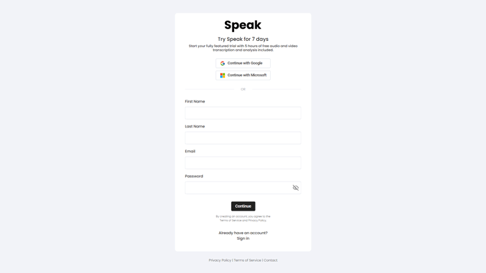 To start your transcription and analysis, you first need to create a Speak account. No worries, this is super easy to do!
