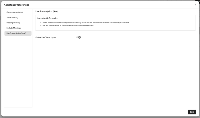 If you’re a subscriber, you can turn on live transcription in your Assistant preferences. When the AI Meeting Assistant joins your call, it automatically creates a media page and shares a live transcript link with meeting participants.