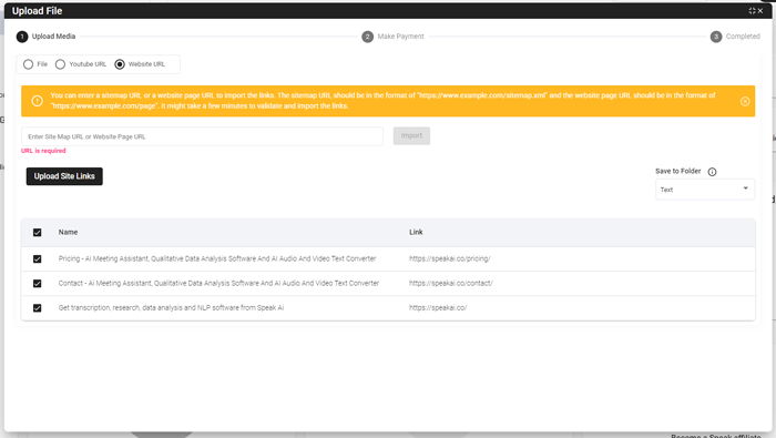 Speak’s AI Web Scraping Tool and Web Scraping Software is very simple! Create an account, log in, and then select “New Upload”, “Website URL” and add either your individual webpages or the entire sitemap.