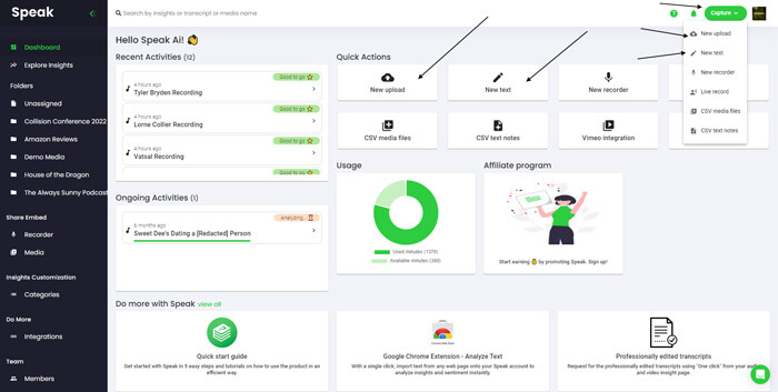 You can easily upload audio, video and/or text into Speak.